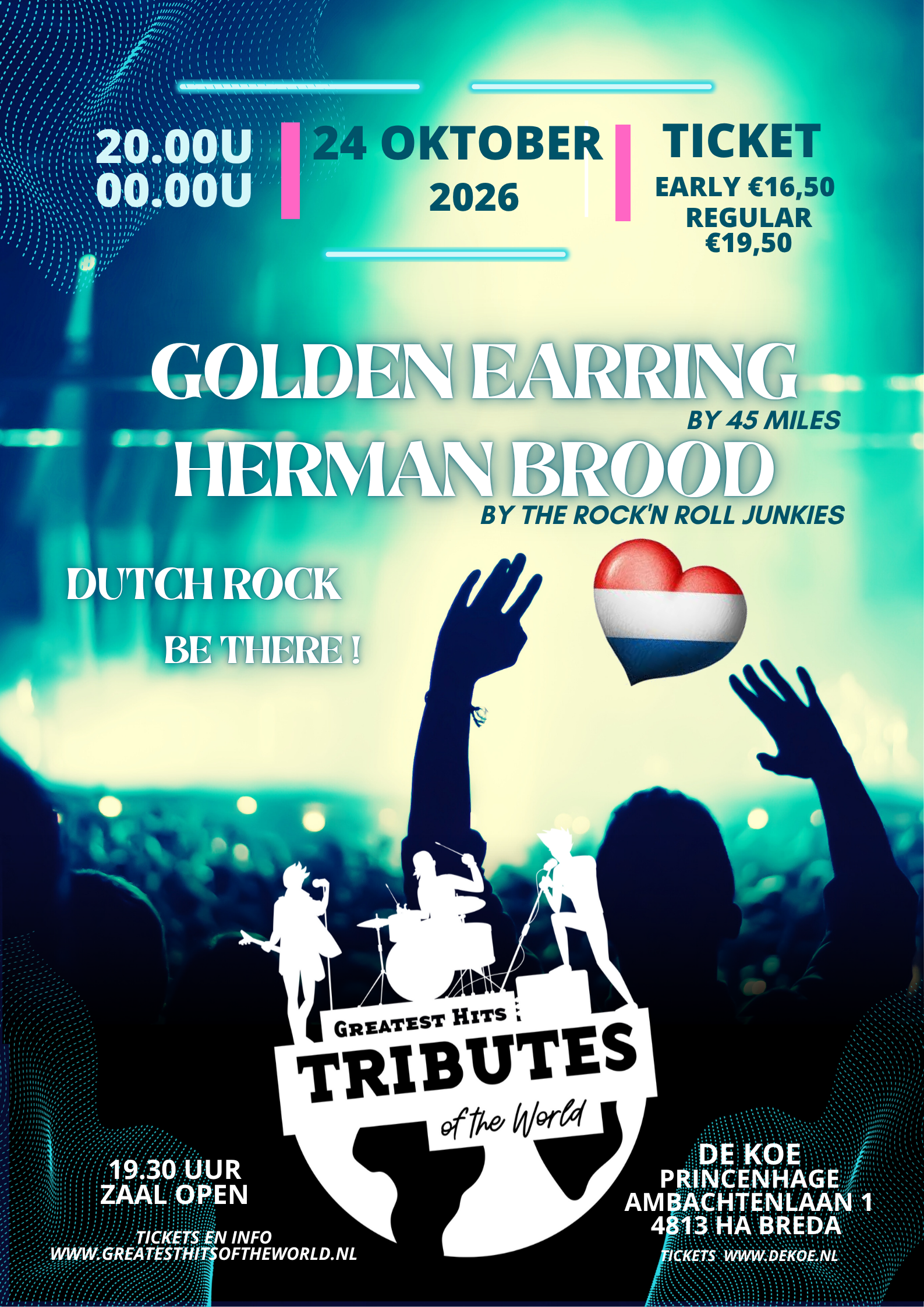 Dutch Rocks met Golden Earring en Herman Brood. Radar Love, When de lady smiles maar wat denk je van de hits als Saturday Night, Hot Shot, Never be Clever en nog vele andere toffe rock nummers komen deze avond voor bij. 45 Miles is de Golden Earring tribute band die menig fans in vervoering zal brengen. De Rock'n Roll Junkies staan garant voor een flinke dosis Herman Brood waar je u tegen zegt.